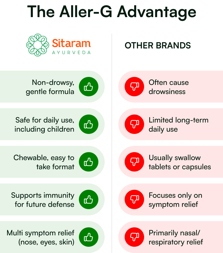 Rooted in timeless Ayurvedic wisdom, Aller-G Tablets offer a gentle, natural solution for both children and adults. This safe, non-sedative formula brings the benefits of traditional herbs into everyday wellness.